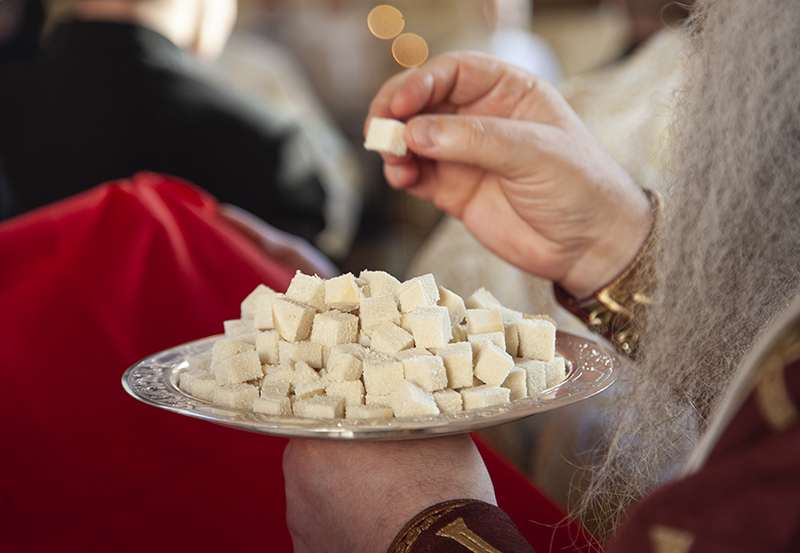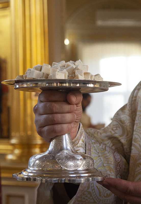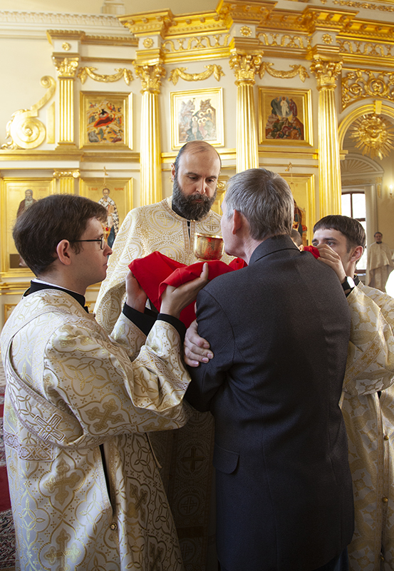 Еще одной особенностью этой Литургии является то, что не только священнослужители, но и миряне причащаются отдельно Тела и отдельно Крови Господа Иисуса Христа. Происходит это так: Архиерей (или священник) исходит из алтаря на амвон, держа в руках дискос с Телом Христовым, диакон выносит потир со Святою Кровью. «И аще суть причащающияся миряне, приходят со смирением ко Архиерею (или иерею), и той, держа в шуйце (левой руке — Авт.) дискос со Святым Хлебом, глаголет: Тело Христово. И отвещает приходяй: Аминь. И влагает Архиерей (или иерей) часть Святаго Хлеба во уста ему, и той снедает ю и приходит к диакону, и глаголет диакон: Кровь Христова, Чаша Жизни. И отвещает приходяй: Аминь. И дает ему диакон пити из чаши мало. И сице причащаются людие…