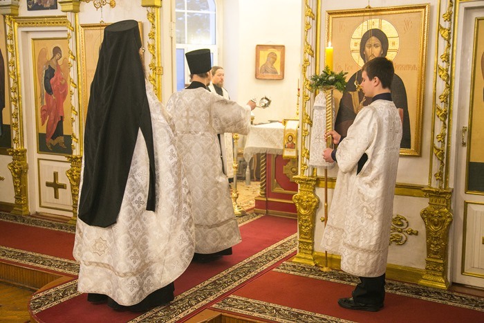 [*Те, кто бывал на Литургии, совершаемой Архиереем, наверное, замечали, что до малого входа Архиерей стоит в центре храма и в Алтарь не заходит, а во время торжественного чина входа он заходит Царскими вратами в Алтарь, где и остается до конца службы. В древности на вечерне духовенство подобным образом до входа молилось в храме, и только во время входа заходило в Алтарь].